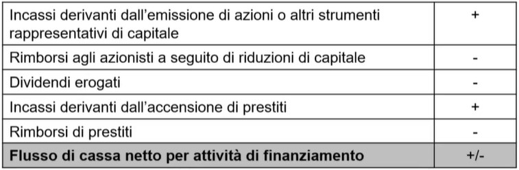 - finanziamento (variazione del patr. netto dovuto ad indebitamento per finanziare l’azienda) é importante che la redazione suddivida in questo modo il cash flow , cioè basandosi sulle origini di tale cashflow.