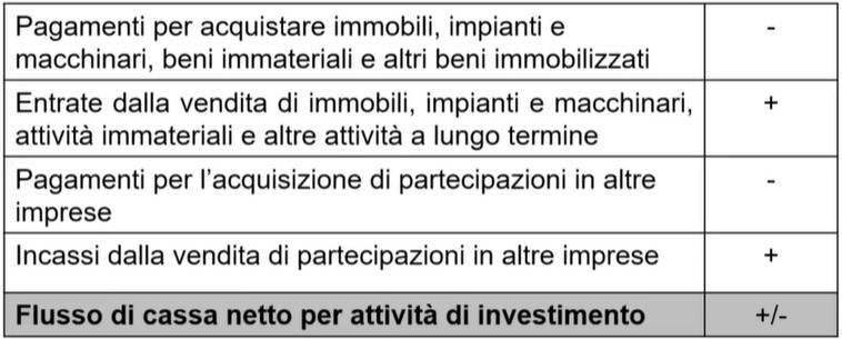 - investimento (acquisizione/cessione di immobilizzazione materiali/immateriali/finanziarie)