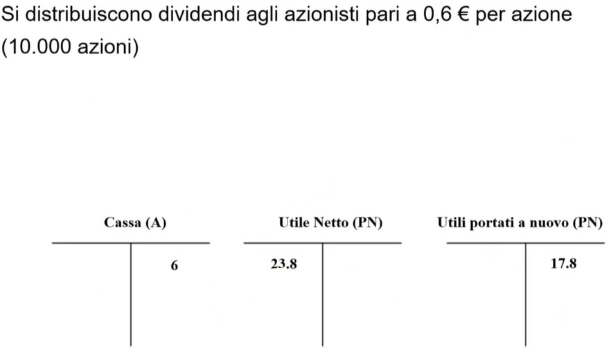 Distribuzione dividendi significa che tolgo dagli utili dell’anno precedente (Utile Netto). Quello che rimane lo porto a Utili Portati a Nuovo e la differenza (i dividendi) vanno fuori dalla cassa.