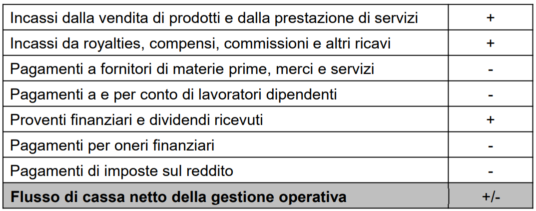 - metodo diretto: il metodo più immediato e si basa sulle principali categorie di incassi e pagamenti lordi