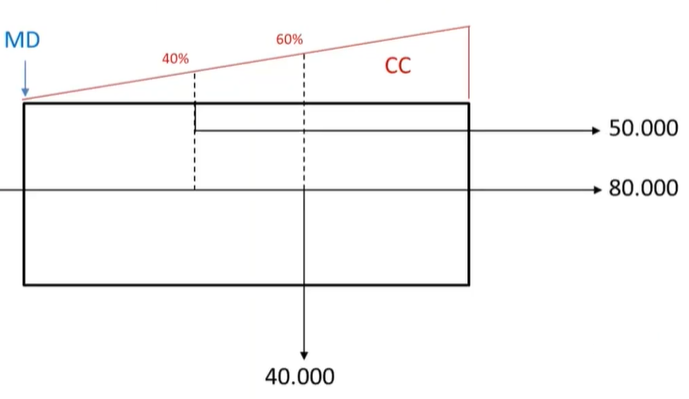 Grafico che mostra che 50k unità sono ‘partite’ da un WIP al 40% per poi diventare prodotti finiti. Nel frattempo 80k unità sono state prodotte e 40k sono ‘uscite’ al 60% della lavorazione. Il grafico mostra inoltre di come i materiali diretti siano inseriti all’inizio della produzione.