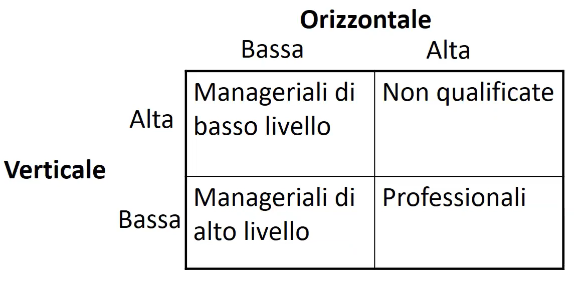 Con specializzazione orizzontale si intende la varietà di mansioni svolte dal lavoratorie. Se il lavoratore è molto specializzato orizzontalmente significa che fa una sola/poche mansione/i. Con specializzazione verticale si intende la distanza o profondità logica che c’è tra il lavoratore e lo svolgimento delle proprie decisioni. Ad esempio un manager ha basso livello di specializzazione poichè prende decisioni per altri e non svolge alcuno dei compiti/mansioni derivate dalle sue decisioni. In genere chi è poco specializzato verticalmente ha anche un’elevata autonomia decisionale.