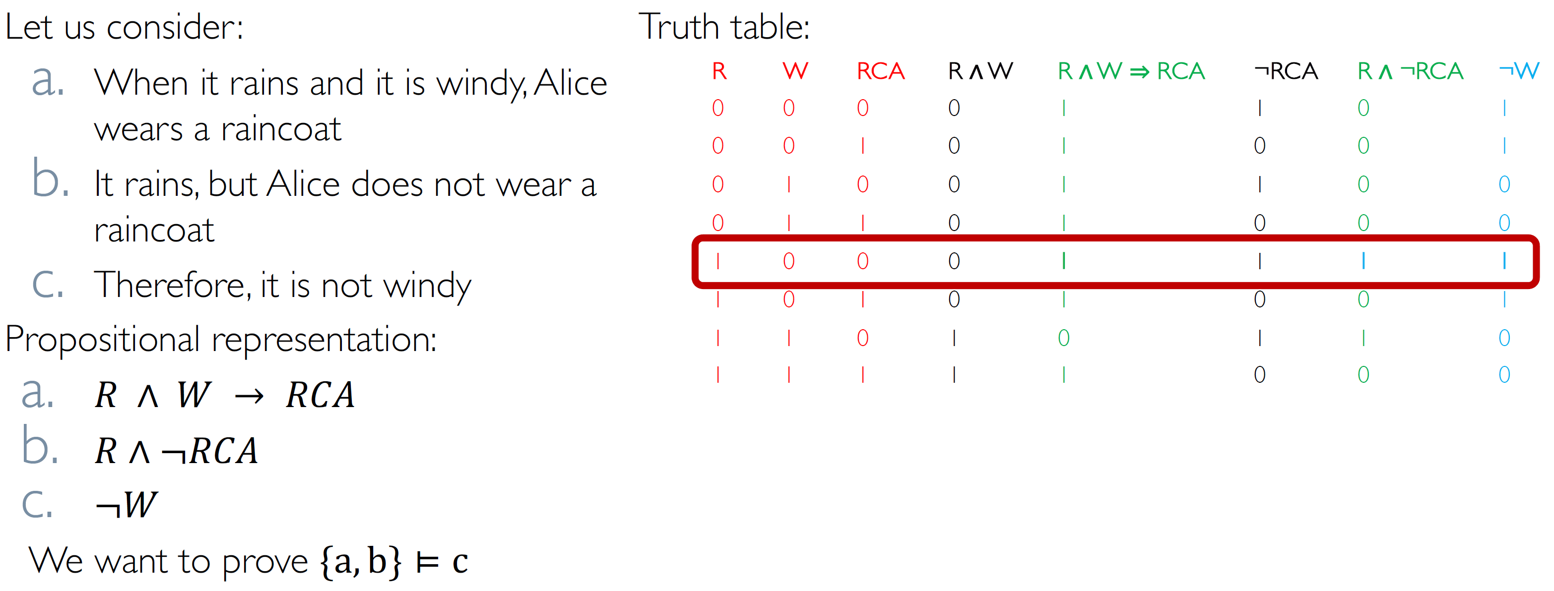 A simple algorithm to prove entailments. This reasoning procedure is sound and complete and always terminates, making reasoning in PL decidable. But remember that it works if the models space is finite! Also MC is inefficient when many propositional symbols are involved, because it has to compute a table of size , where is the number of propositional symbols and is the number of subsentences the appear in the premises and the conclusion.
