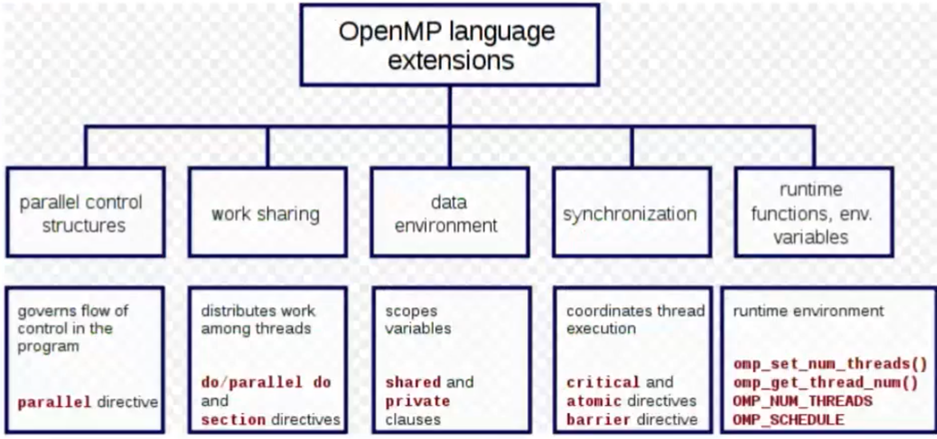 - OpenMP uses a fork-join model, where a master thread forks a specified number of slave threads (so there is a hierarchy of threads).