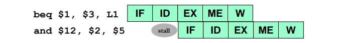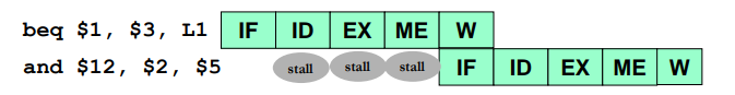 - Without forwarding the branch outcome is available only during MEM stage, so 3 stalls needed.