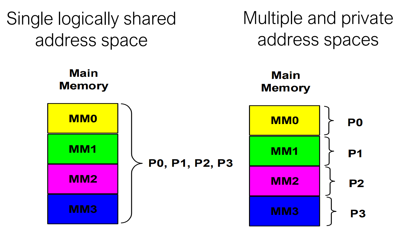 - Multiple logically private address spaces: multiple and private address spaces. Processors communicate through send/receive primitives (message passing). Each processor’s memory is disjoint and cannot be addressed by other processors.
