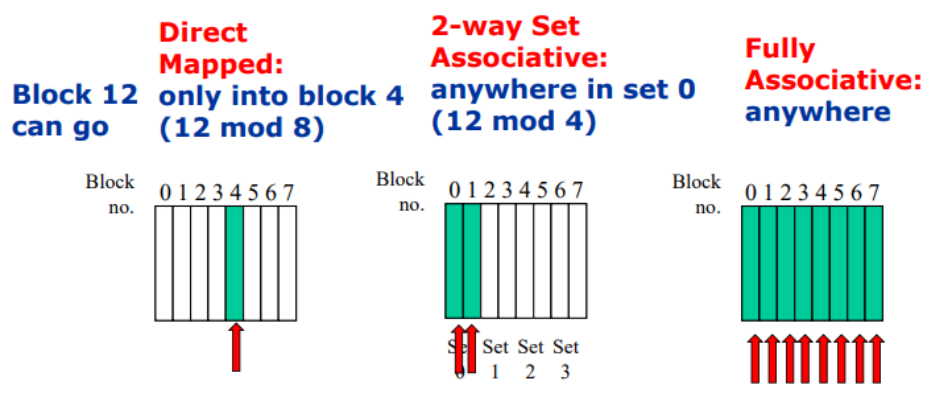 - Fully Associative Cache: a block in the main memory can be placed anywhere in the cache. The block’s address in the cache is determined by a tag field that uniquely identifies the block.
