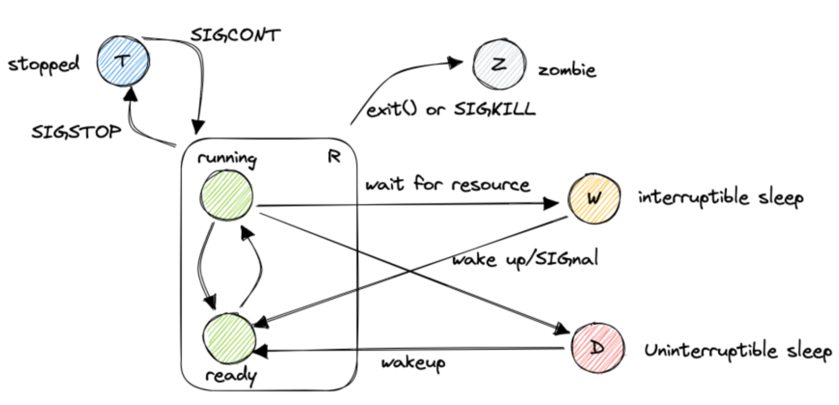 State {R (Running), I (Interruptible), U (Uninterruptible), D (Disk Sleep)} |