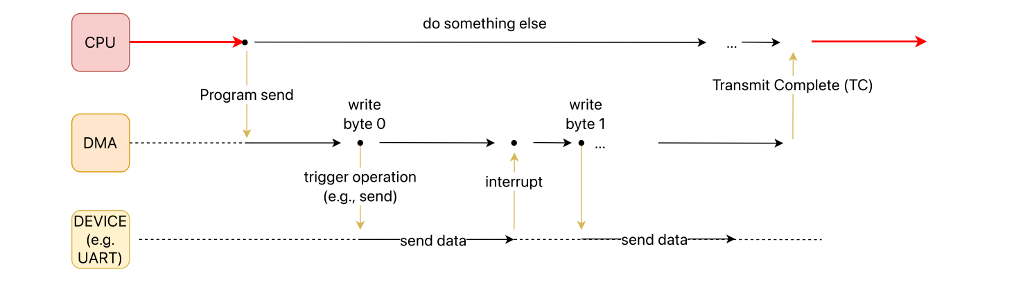 - DMA (Direct Memory Access) which involves using a DMA controller. The DMA controller is like an additional device that independently manages data transfers between different devices and memory. It does so without needing the CPU’s involvement, thereby decoupling it from the transfer process.