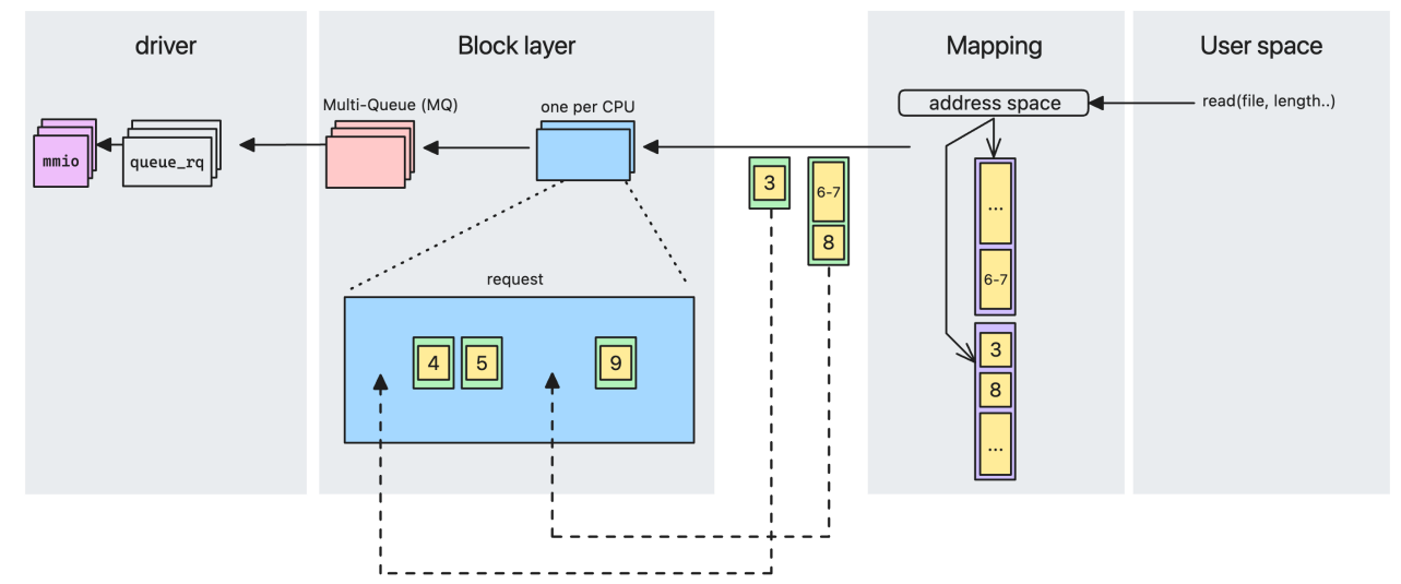 request_queue: This structure represents the queue of pending I/O requests for a block device. It helps in scheduling and optimizing these requests before they are dispatched to the actual device driver. Techniques such as merging adjacent requests are employed to enhance performance through the “hw schedulers”. There also I/O software schedulers on top of hw schedulers to optimize everything: