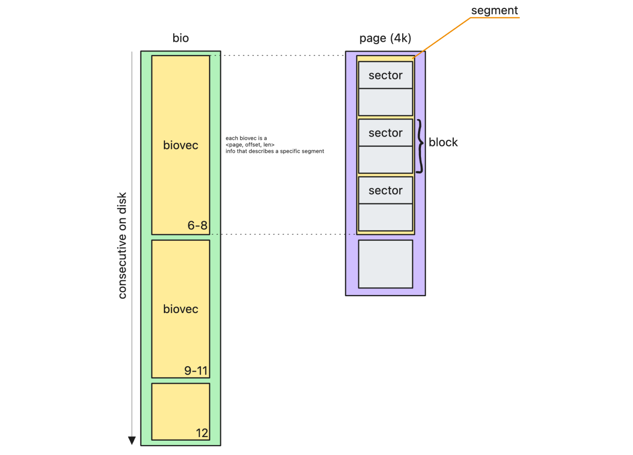 - bio: This structure represents a block I/O operation. A bio can contain multiple segments (bio_vec), each pointing to a contiguous area in memory where data resides or will be placed after an I/O operation.