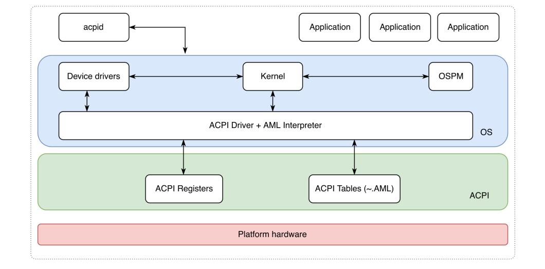 Also the user-space can interact with the kernel’s ACPI through an ACPI daemon, like acpid in Linux, which listens for ACPI events and executes predefined scripts in response.