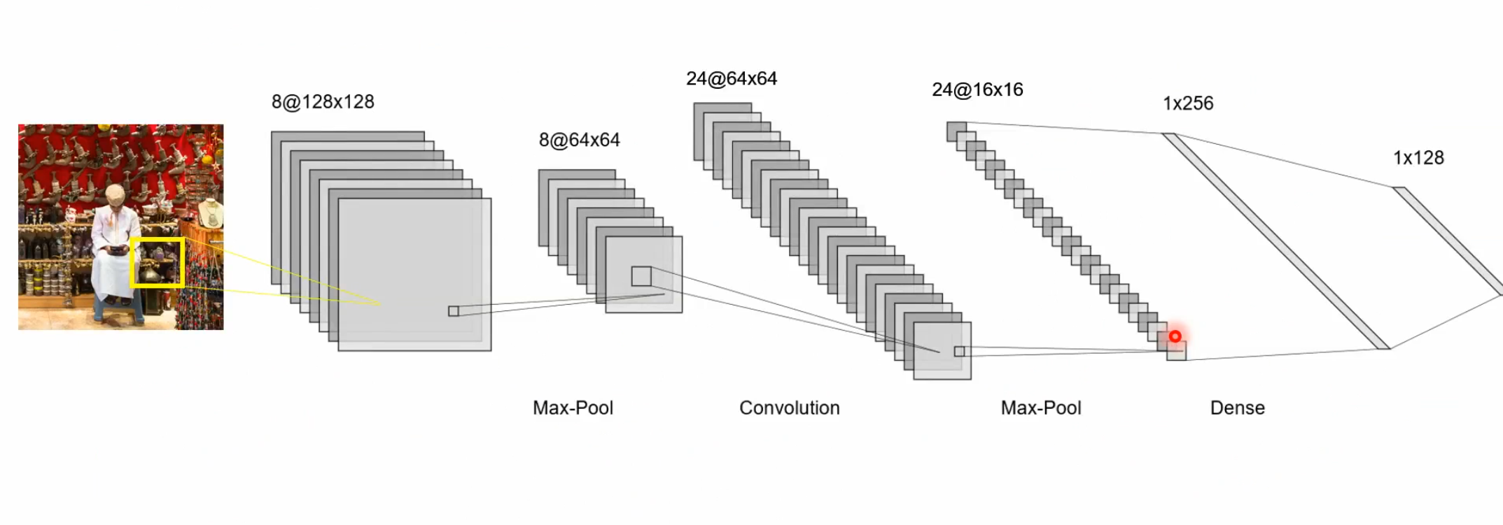 And at the end we have dense layers: “dense” because each output neuron is connected to each input neuron.