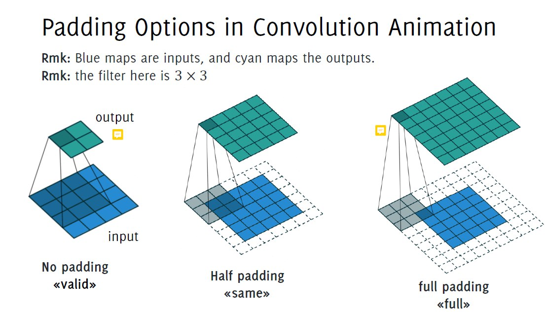 - Padding: often used to match input and output shapes.