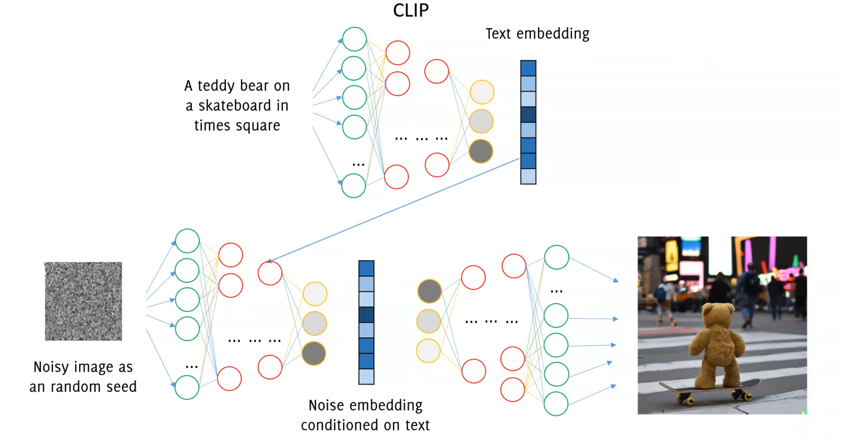 Clip is a huge model, trained from image captions to generate consistent representations of both images and text CLIP is trained by contrastive loss from a training set of images and their caption. To input text into a generative model like DALL-E 3, CLIP is used.