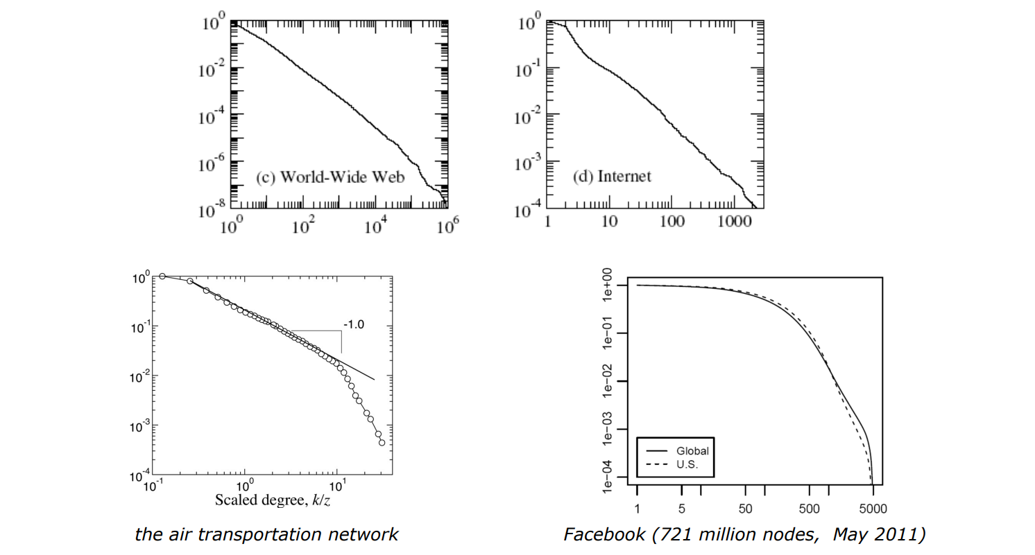 - Power-Law Degree Distribution: implies that there are a few nodes with a very high degree and many nodes with a low degree.