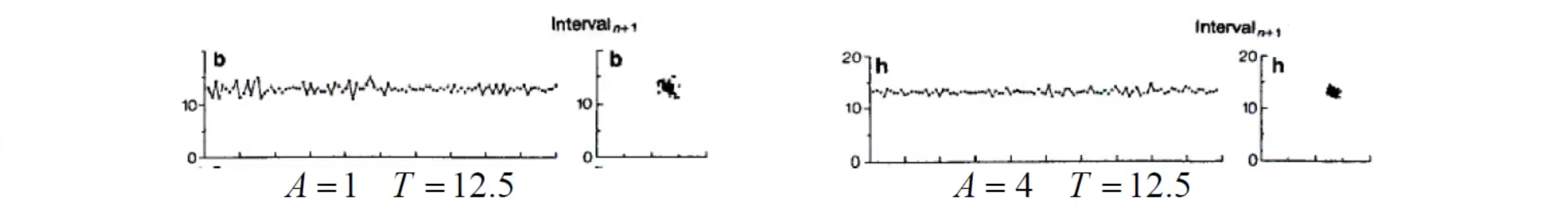 An interesting finding was that synchronization led to an adaptation to the forcing rhythm, reducing both longer and shorter intervals, causing the mean commuting interval to gravitate towards the stimuli period. However, for some , some flashes fail to induce commutation: