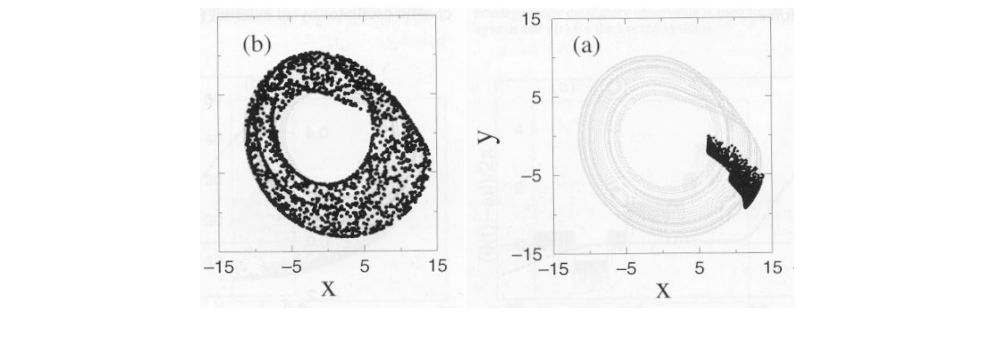 Stroboscopic diagrams can be used to discuss the states of synchronization, with dots representing the state value at time intervals that are multiples of . In an unsynchronized state, dots are scattered throughout the attractor, indicating a distributed phase between and . However, during synchronization, the dots converge within a narrow phase interval.
