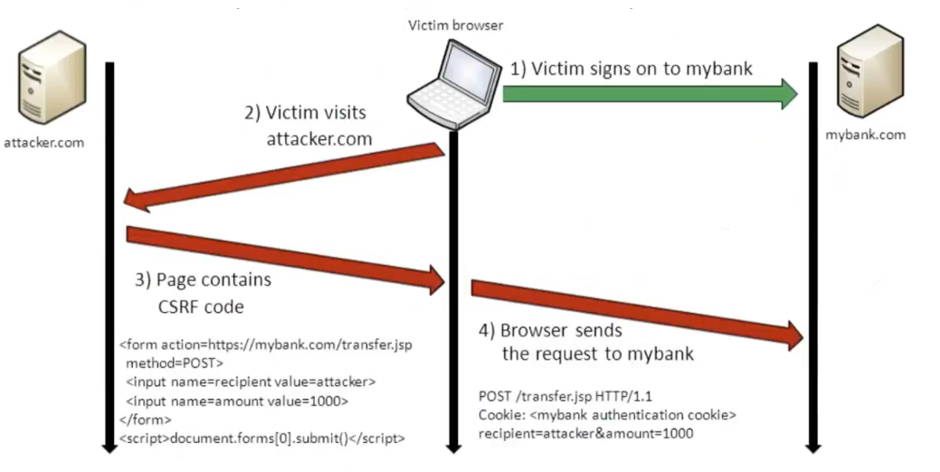 - the victim’s web client executes the malicious web request, tricking the original website’s authentication by using ambient variables.