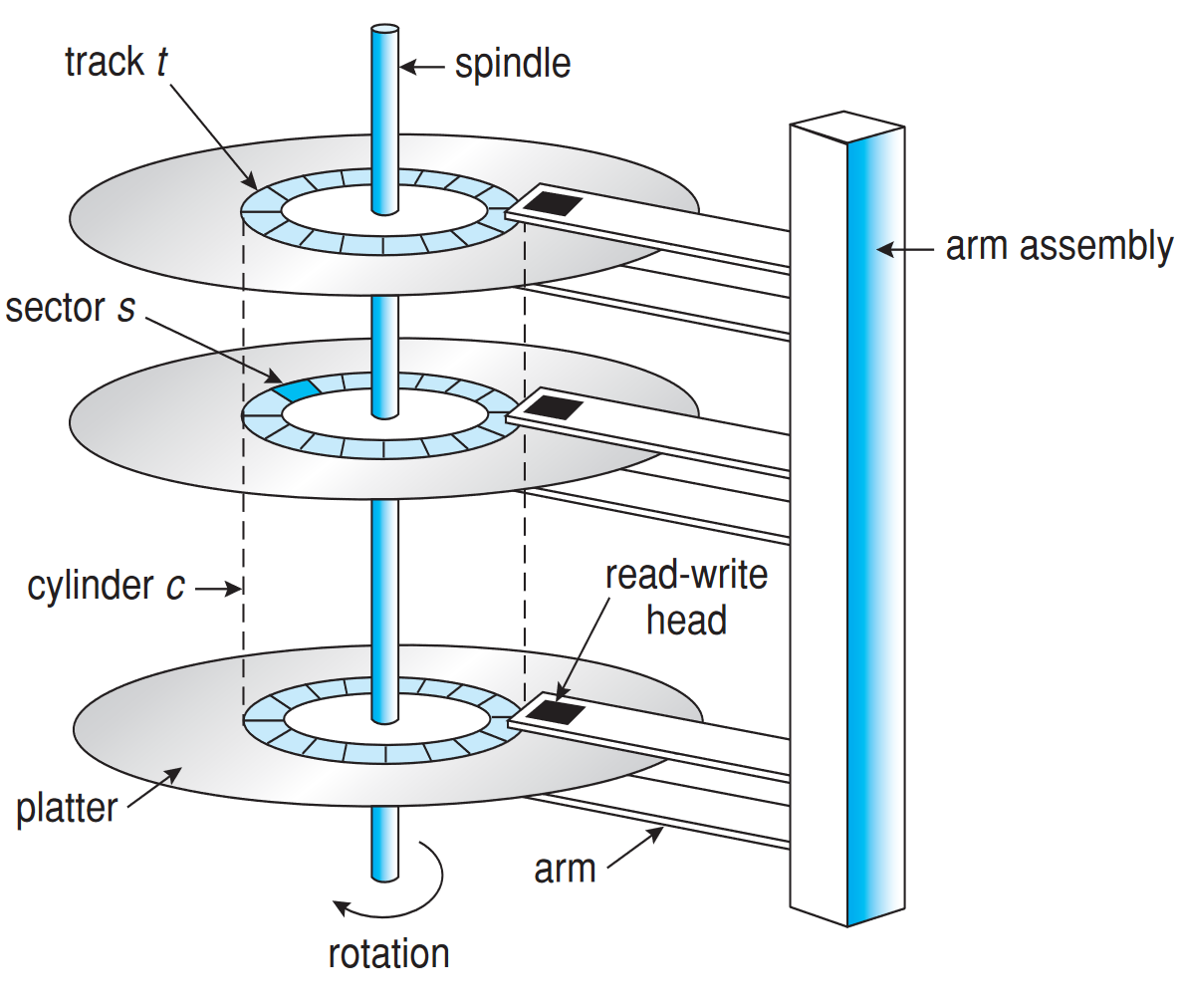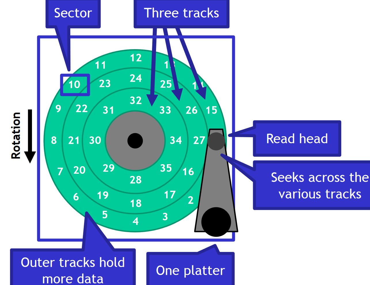 An HDD consists of one or more rigid (“hard”) rotating disks (platters) with magnetic heads arranged on a moving actuator arm to read and write data to the surfaces.