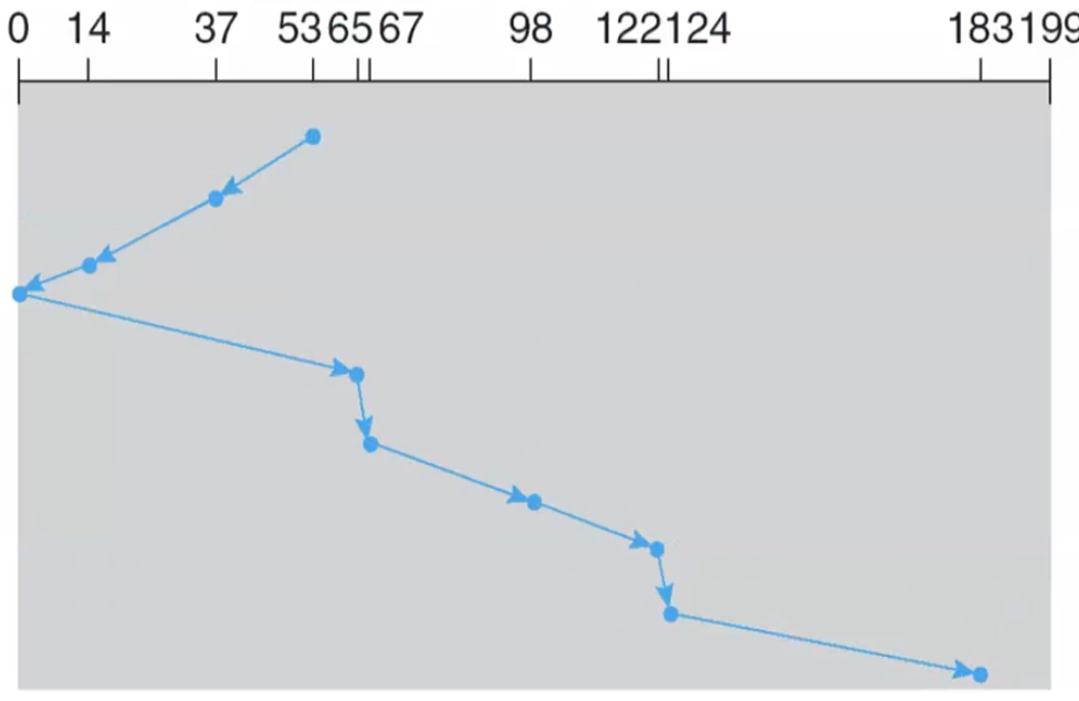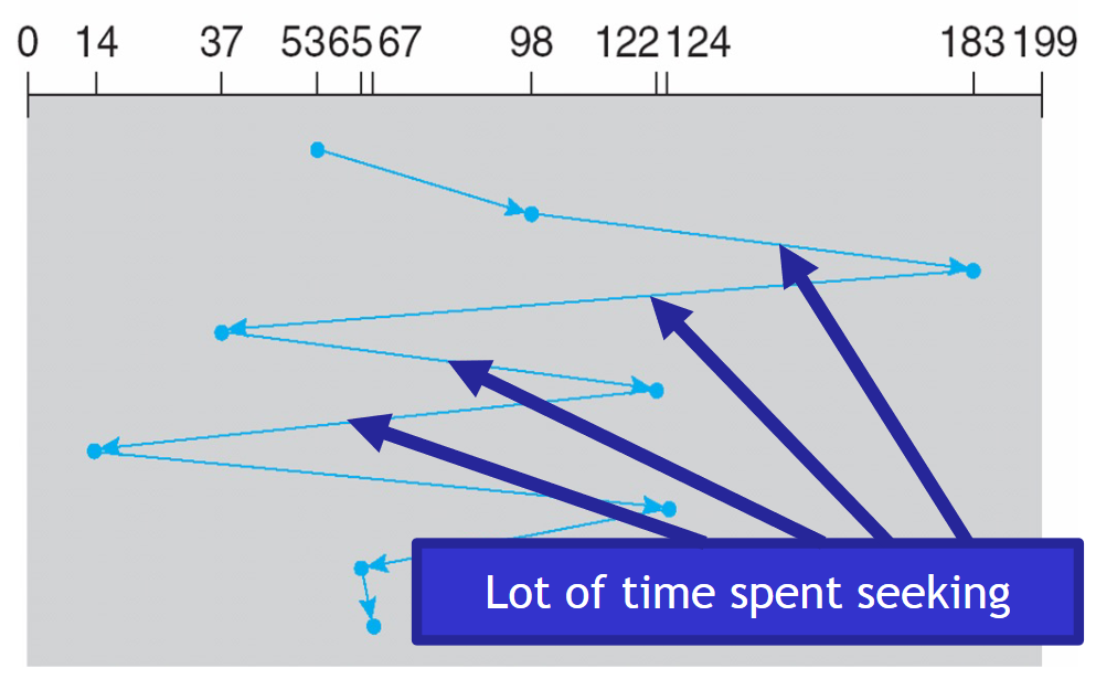 - Shortest seek time first (SSTF): Minimize seek time by always selecting the block with the shortest seek time