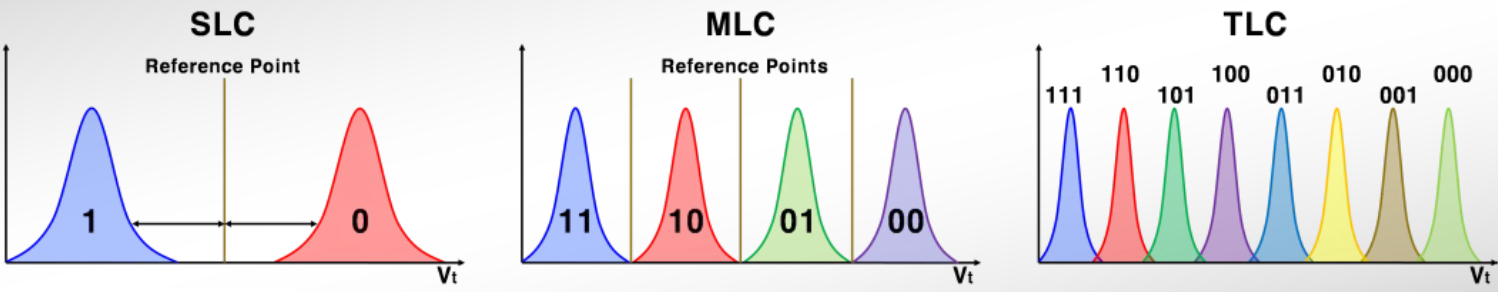 - Single-level cell (SLC): simplest solution. For each cell just a voltage. Single bit per cell.