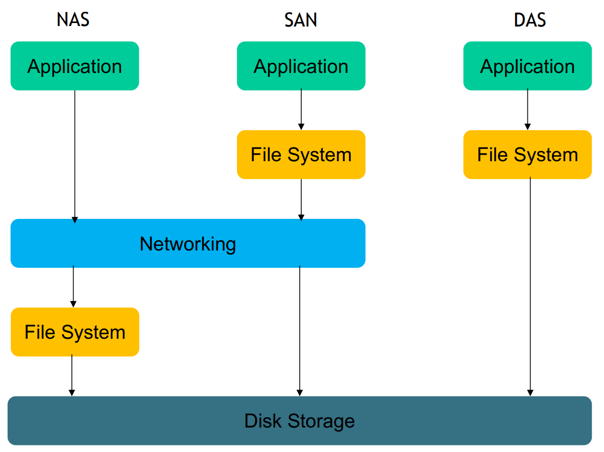 - A Direct Attached Storage (DAS): A DAS is a storage system directly connected to a server or workstation and appears as disks/volumes to the client operating system.