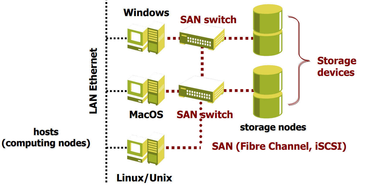 - Storage Area Networks (SAN): Remote storage units are connected to PCs via networking technologies such as Fiber Channel and appear as disks/volumes on the client’s OS.