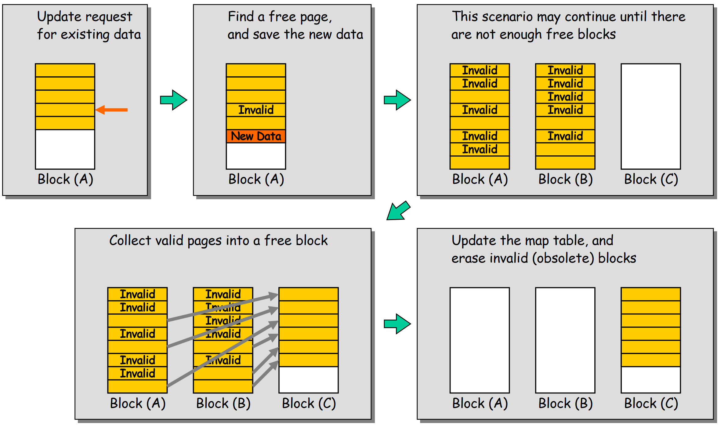 - Wear leveling: distributing writes and erases evenly across all blocks of the device, ensuring that they wear out roughly at the same time. Erasing a block only happens when all the pages within it are unused, and any valid data from other pages is moved to another block before erasing the block entirely.