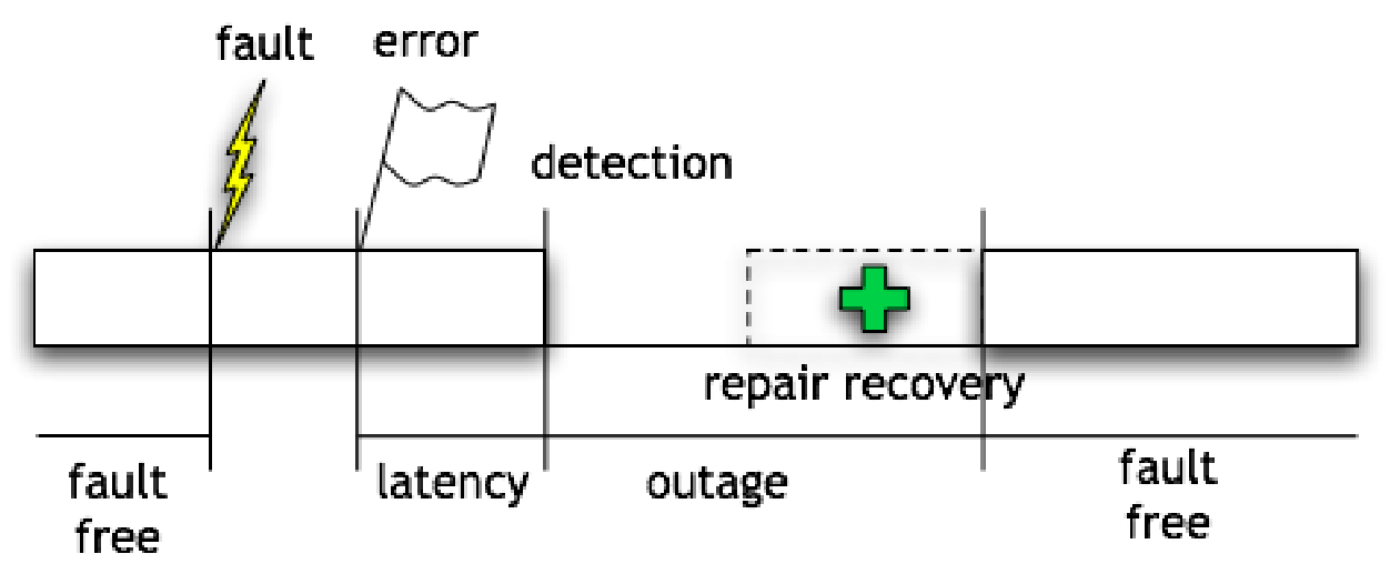 - Mean Time To Failures (): time between the recovery from one incident and the occurrence of the next incident, also known as up-time.