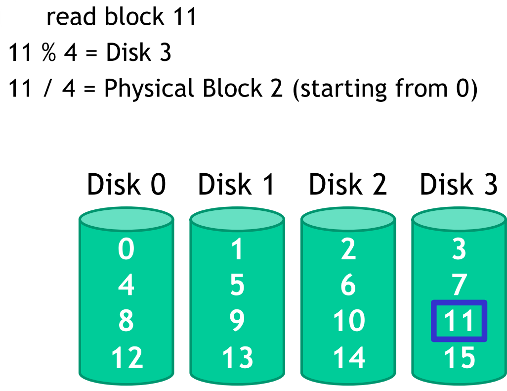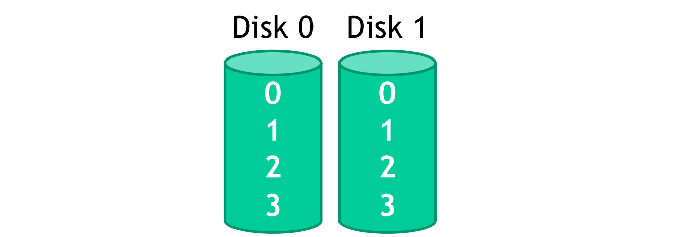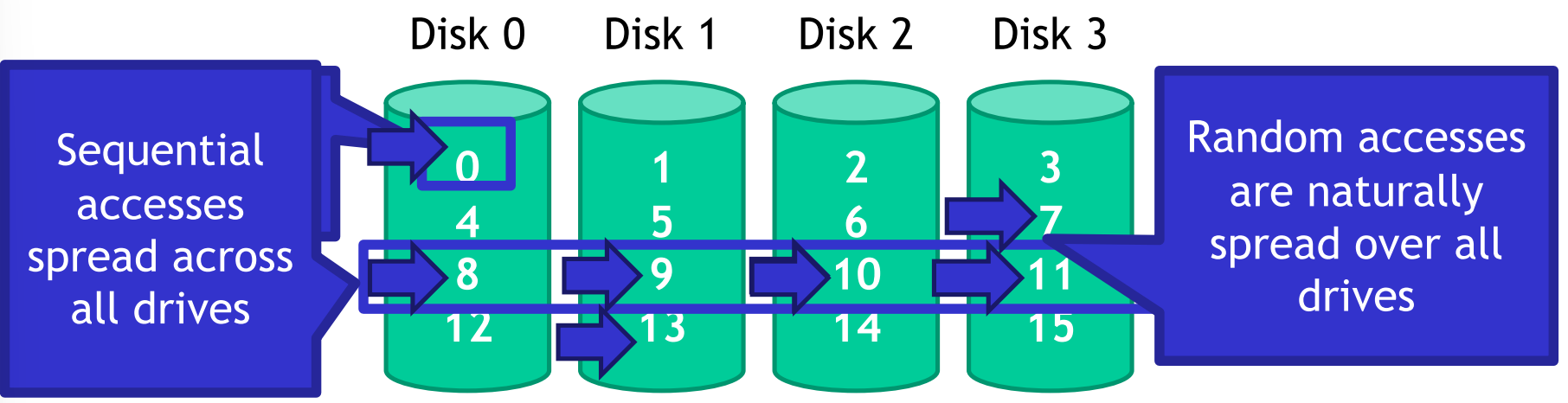 Faster than using a single disk, but reliability is reduced because two disks are more likely to fail than one. Best write performance config since there is no need to update redundant data but still it’s a parallelized approach.