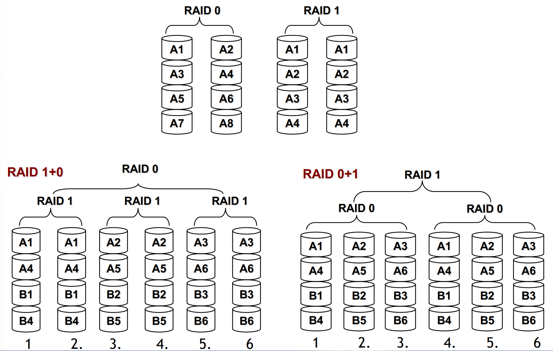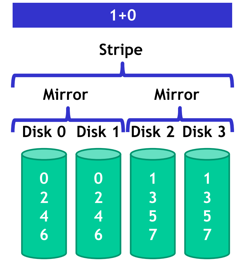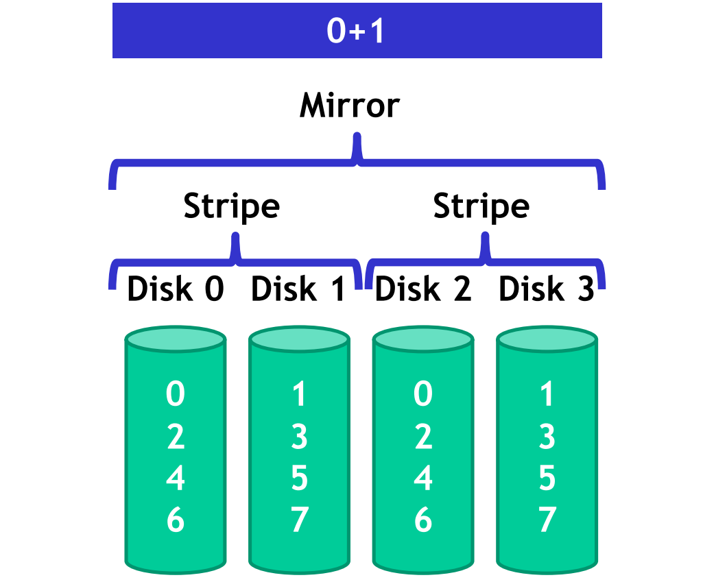 Example of RAID 0 (striped disks) + RAID 1 (mirrored) :