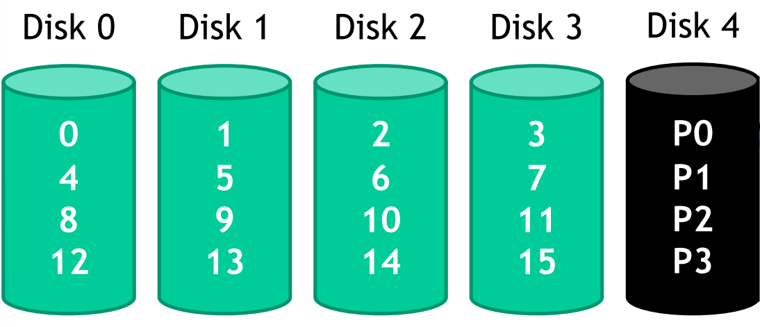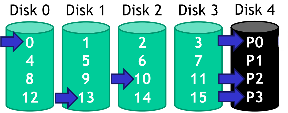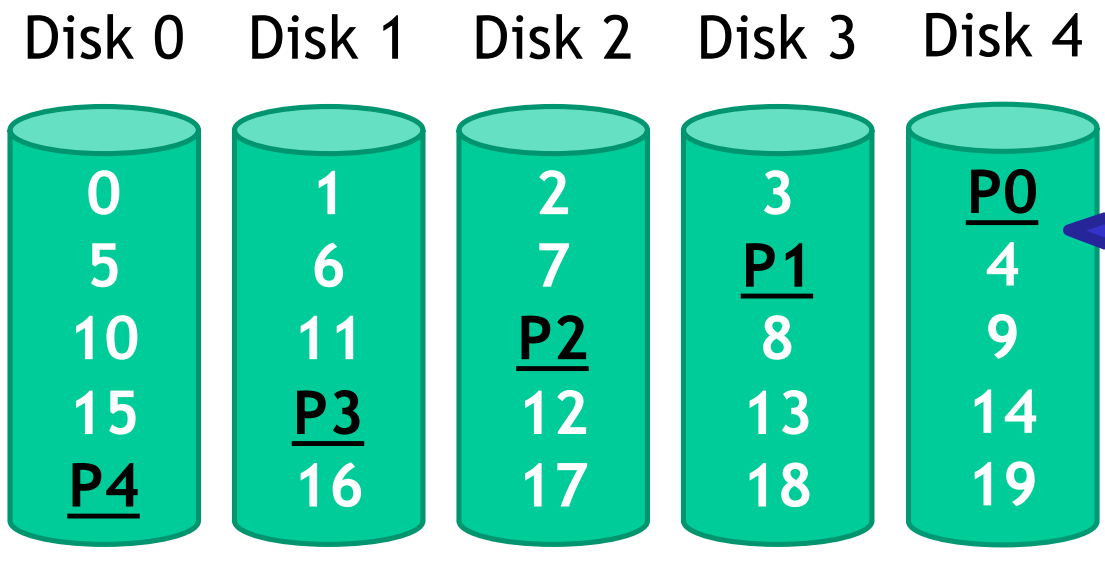 - Parity blocks are spread across all N disks, solving the issue of RAID 4 as writes are evenly spread across all drives.