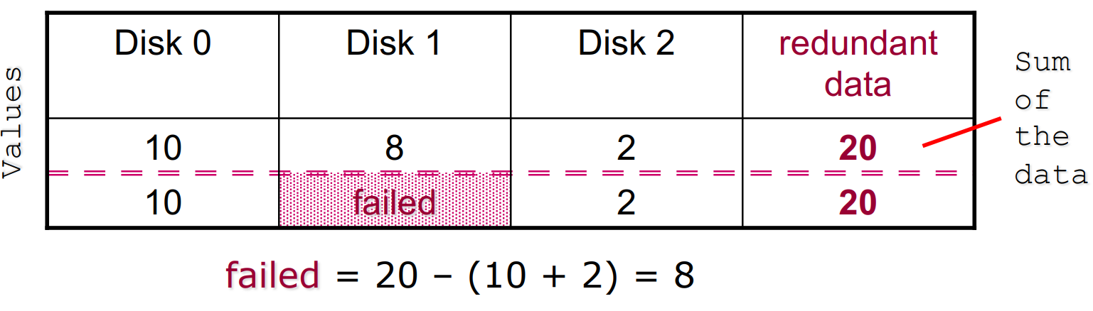 - Additive parity: when you modify disk, you have to read also the information of the other disks to compute the parity block.