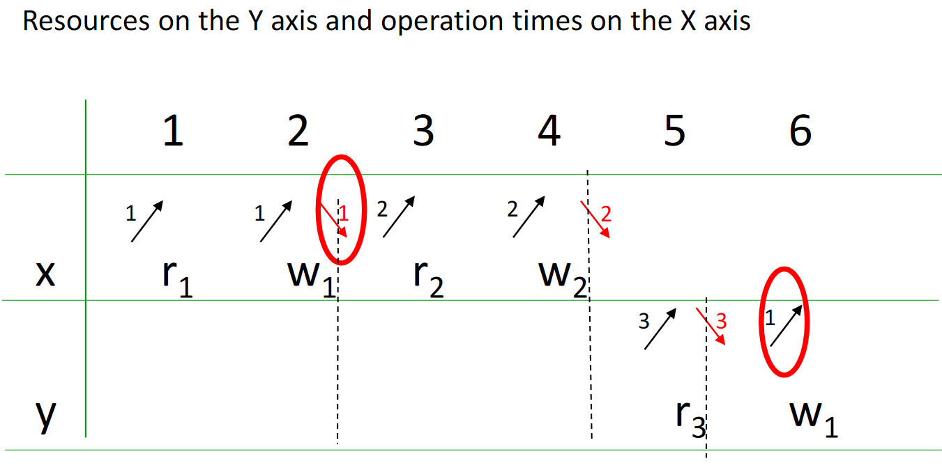 - One arc from node to for each conflict between an operation of and an operation of such that precedes (note that a conflict is between two operations where at least one of them is a write operation… no conflict between two reads obviously).