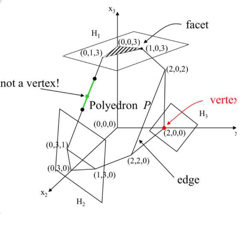 In general, the vertices of the polyhedron represent the “corners” of the feasible region, while the facets represent the bounding surfaces. By considering the vertices and facets of the polyhedron, we can fully describe the feasible region and find the optimal solution to the LP.
