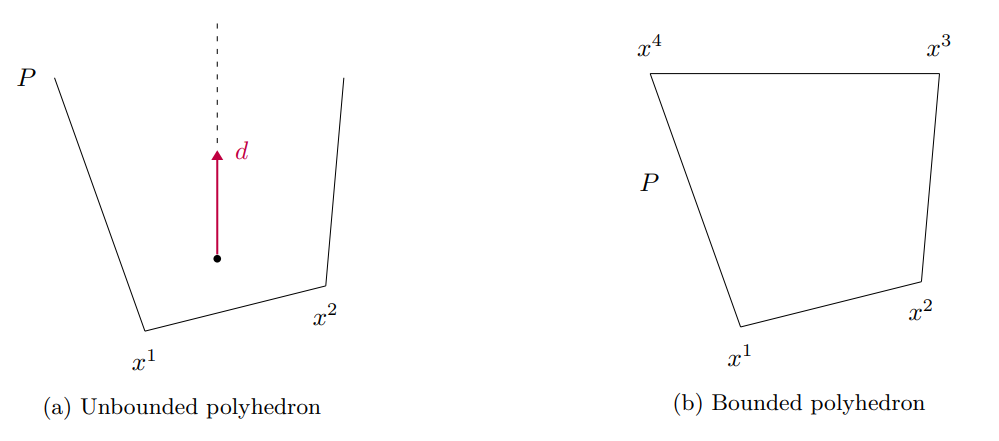 Any point x of polyhedron P can be expressed as a convex combination of vertices x .. xk plus an unbonded feasible direction d of P. Where an unbounded feasible direction of P is a “ray” contained in P.