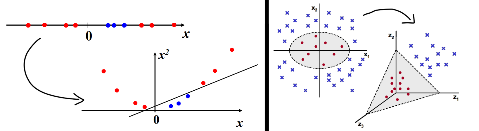 Key idea: sometimes linear separators cannot be found in the input space. But it’s possible to map the input space to a higher-dimensional feature space to make it easier to separate classes or find patterns.