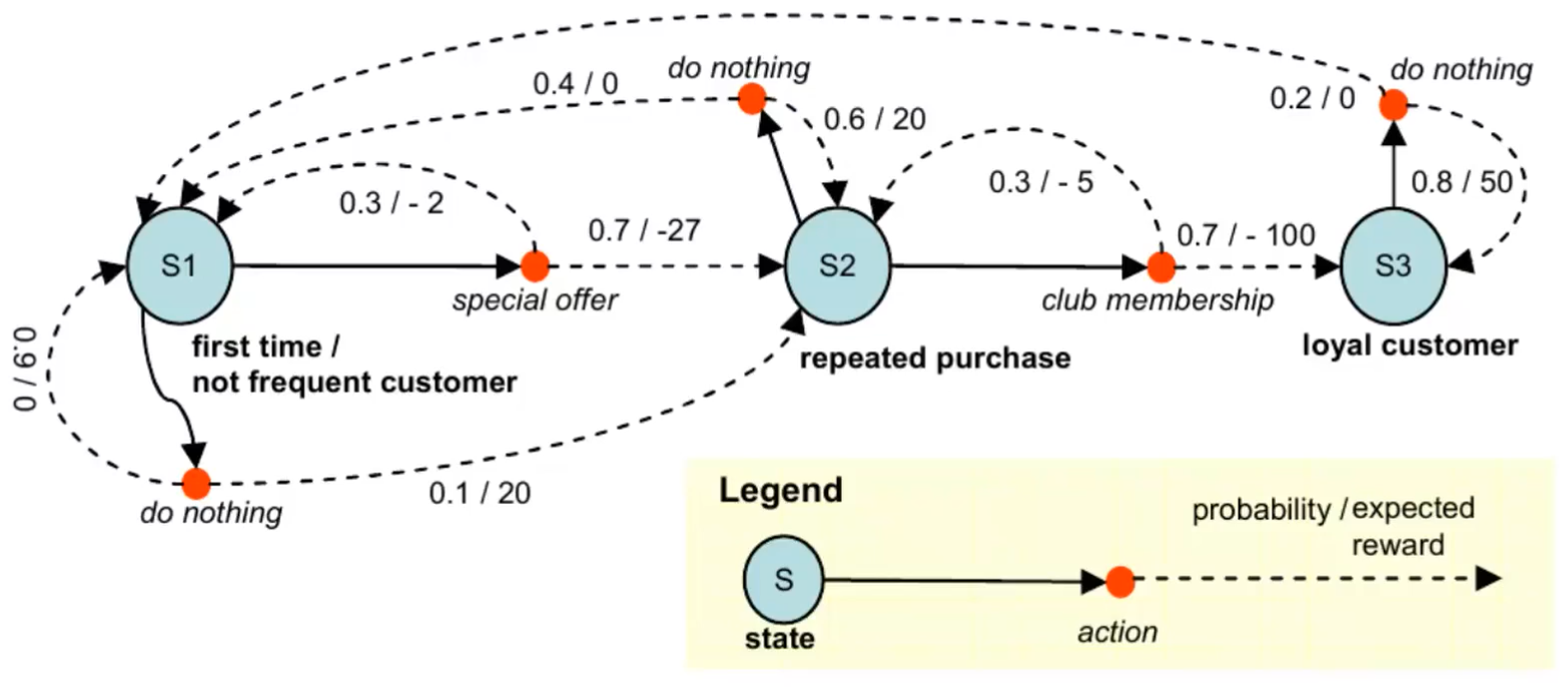 V^\pi(s)=\mathbb{E}^\pi\left[\sum_{t=0}^{+\infty} \gamma^t R\left(s_t, a_t\right) \mid s_0=s\right] & =\sum_{a \in \mathcal{A}} \pi(a \mid s)\left[R(s, a)+\gamma \sum_{s^{\prime} \in \mathcal{S}} P\left(s^{\prime} \mid s, a\right) V^\pi\left(s^{\prime}\right)\right] \\ & =R^\pi(s)+\gamma \sum_{s^{\prime} \in \mathcal{S}} P^\pi\left(s^{\prime} \mid s\right) V^\pi\left(s^{\prime}\right) \end{aligned}$$ We can invert the matrix (computationally costly) and say: $$V^\pi=\left(I-\gamma P^\pi\right)^{-1} R^\pi$$ or we can simply approximate the $V^{\pi}$ in an **iterative** and **recursive** way: $$V^\pi=R^\pi+\gamma P^\pi V^\pi$$ Both methods have their pros and cons, and the choice between them depends on the specific requirements of the problem. In code, the first method uses a direct, closed-form solution: ``` python V1 = np.linalg.inv(np.eye(nS) - gamma * pi @ P_sas) @ (pi @ R_sa) ``` *Remember that: The `@` symbol in Python is used for matrix multiplication.* Here, `np.linalg.inv` computes the inverse of the matrix $(I - \gamma P^\pi)$, where $I$ is the identity matrix. This method can be computationally expensive, especially when the number of states or actions is large. Additionally, when $\gamma=1$, the matrix to be inverted becomes singular, meaning it does not have a unique inverse, leading to potential computation errors. The second method applies the Bellman expectation equation **iteratively** until the change in the value function between iterations is less than a predefined tolerance: ``` python V_old = np.zeros(nS) tol = 0.0001 V2 = pi @ R_sa while np.any(np.abs(V_old - V2) > tol): V_old = V2 V2 = pi @ (R_sa + gamma * P_sas @ V) ``` This iterative method is more computationally efficient and doesn't suffer from the singularity issue when $\gamma=1$. However, it might take a long time to converge to the true value function if the tolerance is set too low. ### Markov Reward Processes and Policies A Markov reward process is a tuple $\langle\mathcal{S}, \mathcal{P}, \mathcal{R}, \gamma\rangle$, where $\mathcal{S}$ is a set of states, $\mathcal{P}$ is a transition probability matrix, $\mathcal{R}$ is a reward function, and $\gamma$ is a discount factor. A policy $\pi$ defines the behavior of an agent by determining actions based on the current state. Policies can be categorized as Markovian or history-dependent, deterministic or stochastic, and stationary or non-stationary. - Markovian examples: chess, Rubik's cube - Non-Markovian examples: poker, blackjack (requires information about past cards that have already been played) A policy fully defines the behavior of the agent by determining which action to take at each step. Policies can be categorized as: - **Markovian vs history dependent**: A policy is Markovian if it only depends on the current state. A policy is history-dependent if it also depends on the previous states. - **Deterministic vs stochastic**: A policy is deterministic if, given a state, the action taken is always the same, creating a deterministic mapping between states and actions. A policy is stochastic if, given a state, there is a probability distribution over the actions. - **Stationary vs non-stationary**: A policy is stationary if it does not depend on time, but **only on the state**. A policy is non-stationary if it depends on both time and states. Nothing prevents a policy from considering real states and previous actions when determining which action to play. A history-dependent policy, as the name suggests, depends on everything that happened in the past. A Markovian policy, by contrast, depends only on the current state. **For Markov decision processes, Markovian policies are sufficient.** There is no need to base decisions on the entire history. However, in **finite** horizon and Markov decision processes, non-stationary policies may be necessary. If the same state is encountered at the beginning and end of a certain number of steps, it is not guaranteed that the same action will be played in both cases. It may be more beneficial to reach certain states at the beginning, while maximizing immediate reward becomes important towards the end. This distinction does not exist in **infinite** horizon scenarios where there is no endpoint. In an **infinite** horizon MDP, Markovian stationary deterministic policies are sufficient. ### Bellman operator $T^\pi$ The Bellman operator simplifies expectation equations, helping to find the best performance in a Markov Decision Process. Repeatedly using the Bellman operator leads to converging on a solution. The optimal value function shows the highest utility achievable in every state. Choosing the Bellman operator for the Bellman equation is recommended as it offers a computationally efficient way to approximate the value function in an MDP. The state-value function $V^\pi(s)$ of an MDP is the expected return starting from state $s$, and then following policy $\pi$:V^\pi(s)=E_\pi\left[v_t \mid s_t=s\right]