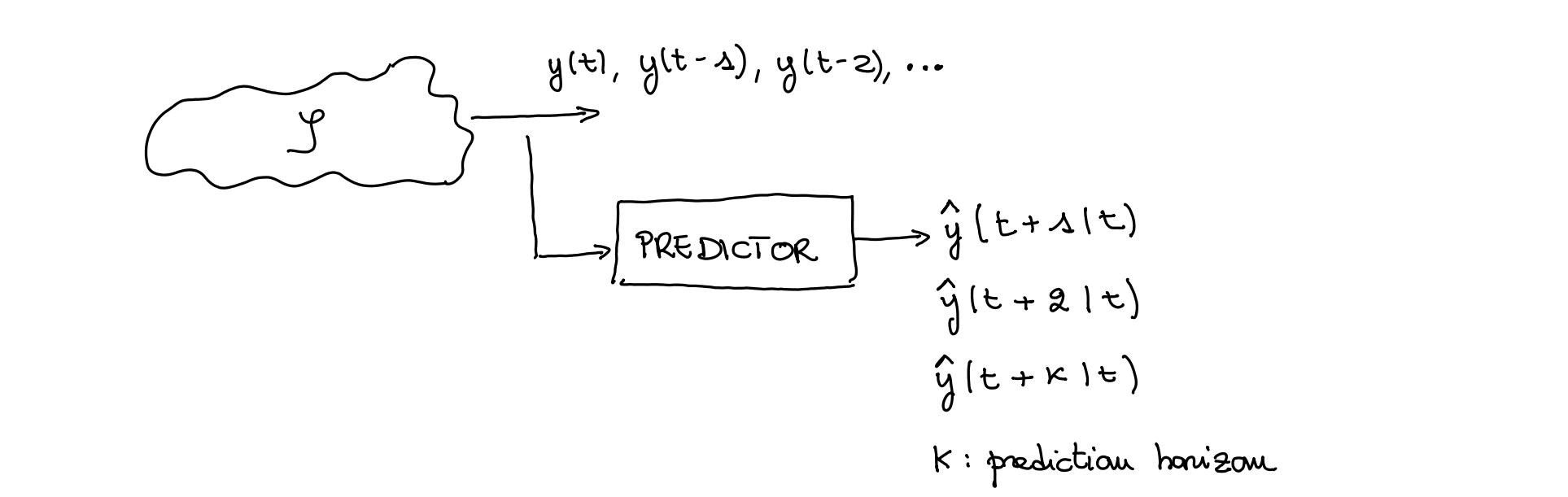 \tilde{y}(t) &= y(t) - my \\ \tilde{e}(t) &= e(t) - \mu \end{aligned}$$ Redefine the process using unbiased elements: $$ \tilde{y}(t+k|t) = \frac{C(z)}{A(z)} \cdot \tilde{e}(t)$$ And apply the generic formulas for the predictor. At the end we can make the prediction adjustment for non-zero-mean: $$ \hat{y}(t+k|t) = \tilde{y}(t+k|t) + my $$ $$\begin{aligned}\hat{y}(t+k|t)&=\frac{F(z)}{C(z)}\tilde{y}(t)+my=\frac{F(z)}{C(z)}(y(t)-my)+my\\&=\frac{F(z)}{C(z)}y(t)-\frac{F(z)}{C(1)}my+my\end{aligned}$$ and the final formula is: $$ \hat{y}(t+k|t) = \frac{F(z)}{C(z)} \cdot y(t) + \left(1 - \frac{F(1)}{C(1)}\right) \cdot my $$ ## ARX and ARMAX We want to predict the generic ARMAX process: $$y(t)=\frac{C(z)}{A(z)}e(t)+\frac{B(z)}{A(z)}u(t-d)$$ where $d$ is the pure delay. The ARMAX predictor from data: $$\widehat{y}(t|t-k)=\frac{F_{k(z)}}{C(z)}y(t-k)+\frac{B(z)E(z)}{C(z)}u(t-d)$$ The ARMAX 1-step predictor ($E(z)=1$) from data: $$\widehat{y}(t|t-1)=\frac{C(z)-A(z)}{C(z)}y(t-1)+\frac{B(z)}{C(z)}u(t-d)$$ ### Demonstration Assuming already canonical $\frac{C(z)}{A(z)}$ and $u(t)$ known process (so completely **deterministic**) we only need predictor for stochastic part. Said this we compute the predictor in a similar way as before: $$y(t)=\frac{C(z)}{A(z)}e(t)+\frac{B(z)}{A(z)}u(t-d)$$ Now, let's consider the long division between $C(z)$ and $A(z)$: $$\dfrac{C(z)}{A(z)}=E(z)+\frac{F(z)}{A(z)}$$ Which can be written as: $$A(z)=\frac{C(z)-F(z)}{E(z)}$$ Let's put it in the ARMAX equation: $$\left(\frac{C(z)-F(z)}{E(z)}\right)y(t)=C(z)e(t)+B(z)u(t-d)$$ Let's rewrite it as: $$C(z)y(t)=F(z)y(t)+C(z)E(z)e(t)+B(z)E(z)u(t-d)$$ Let's divide by $C(z)$: $$y(t|t-k)=\frac{F(z)}{C(z)}y(t-k)+\frac{B(z)E(z)}{C(z)}u(t-d)+E(z)e(t)$$ Last term as usual is unpredictable at time $t-k$ : $$\widehat{y}(t|t-k)=\frac{F_{k(z)}}{C(z)}y(t-k)+\frac{B(z)E(z)}{C(z)}u(t-d)$$